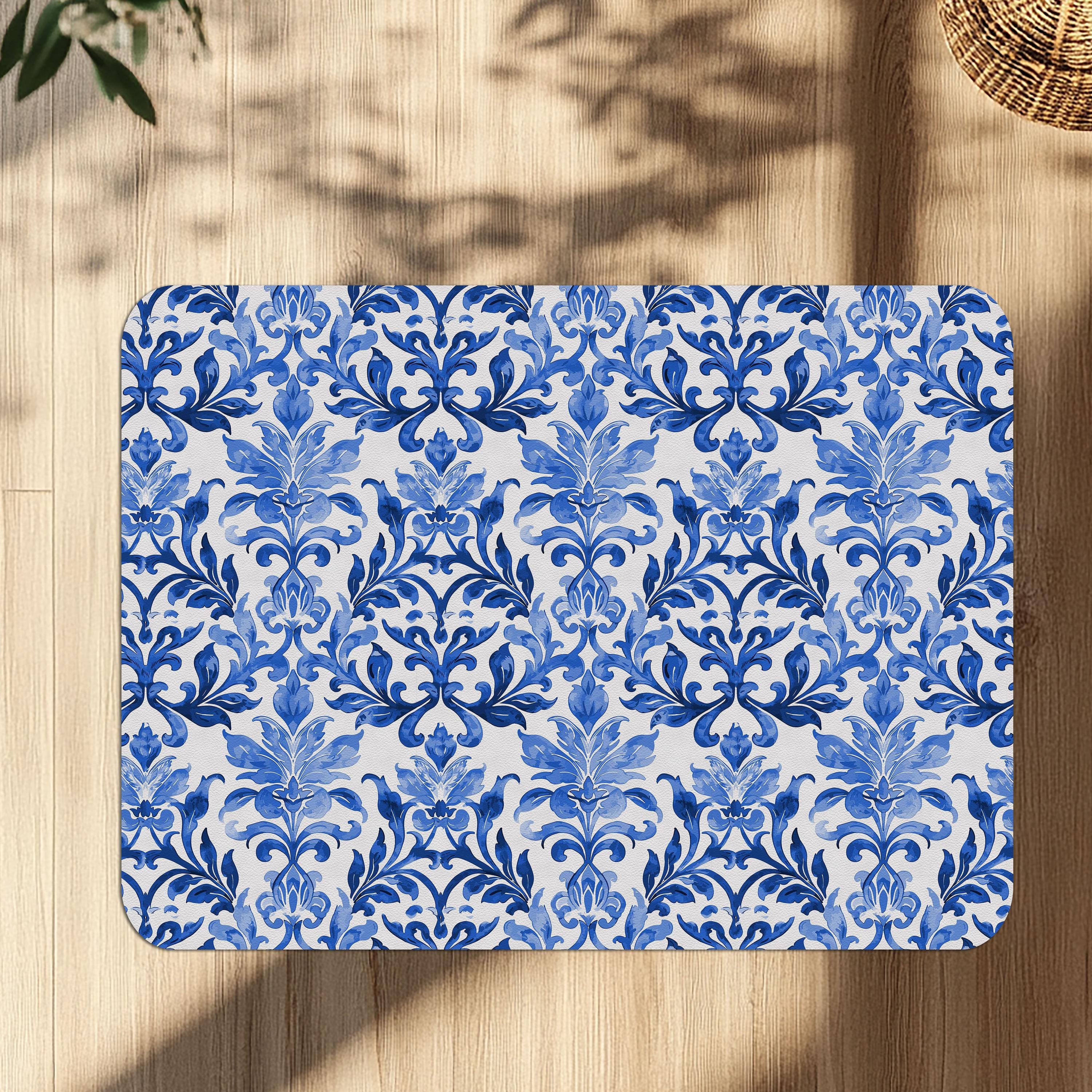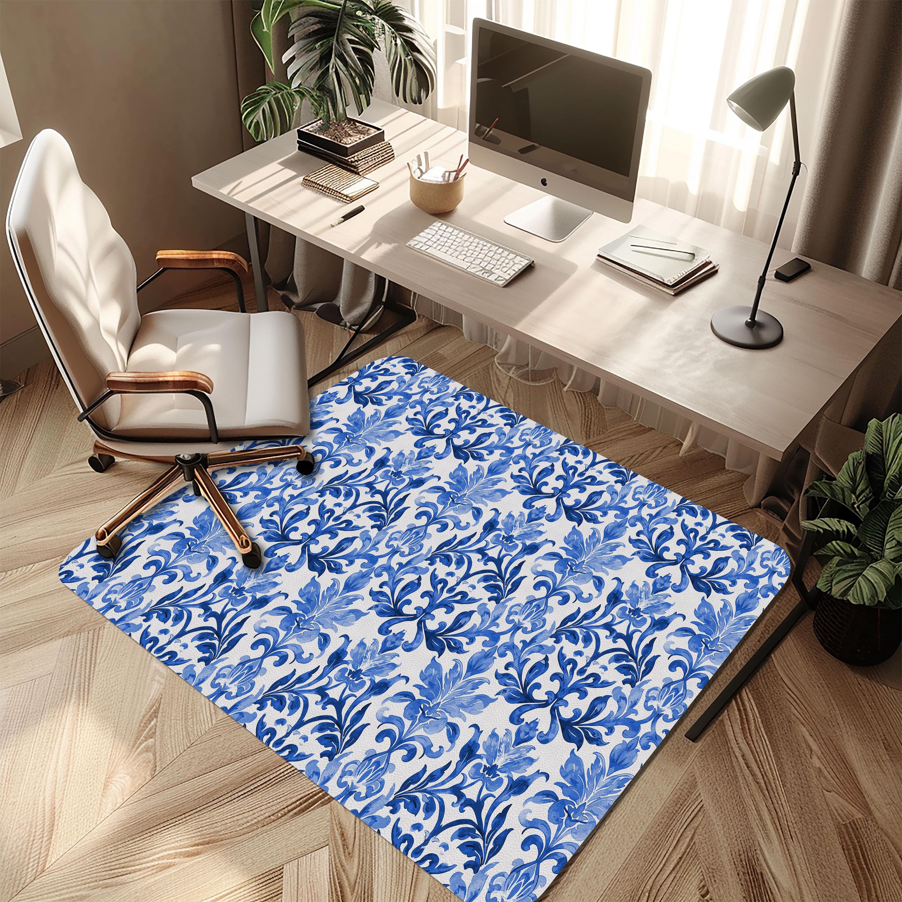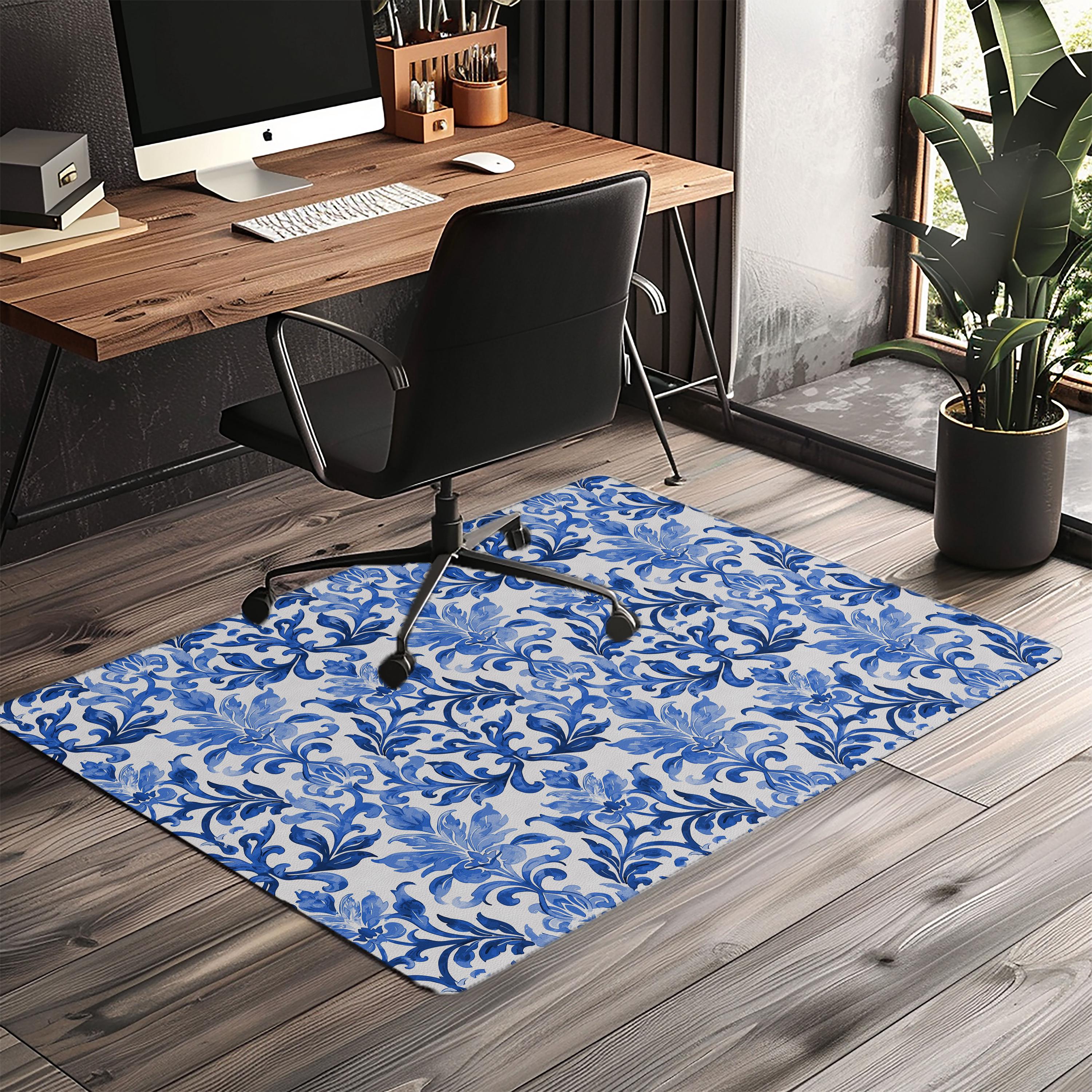 Blue Damask Office Chair Mat: Non-Slip PU Leather Floor Protector