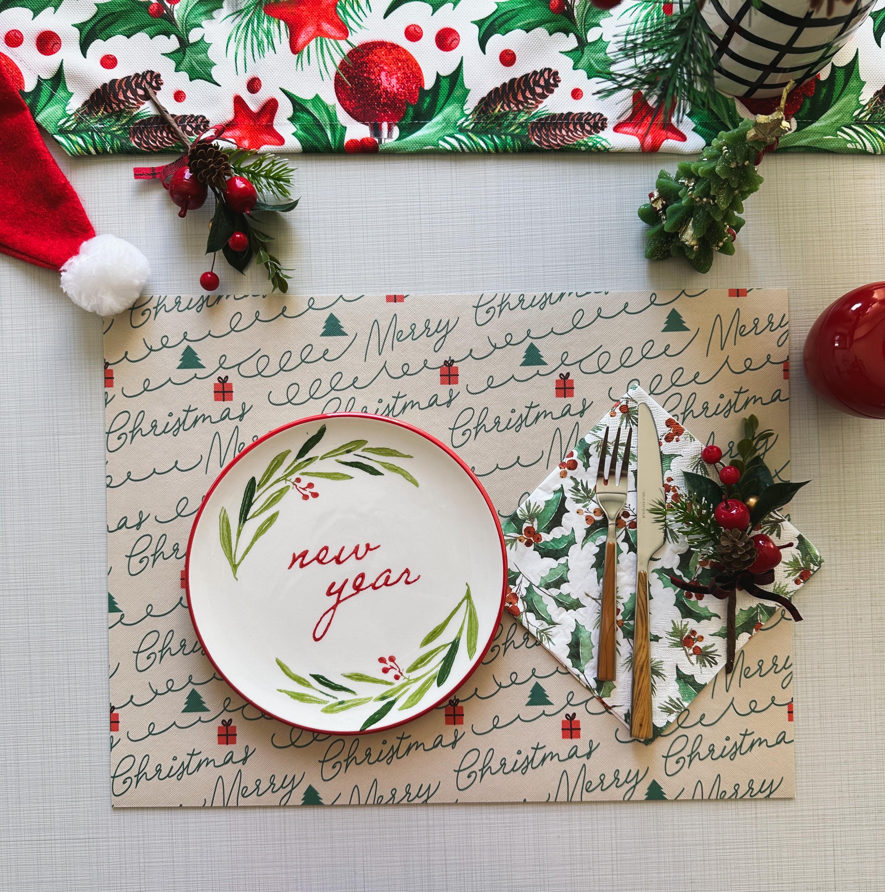 Merry Christmas Script Placemat: Beige Faux Leather Holiday Table Decor